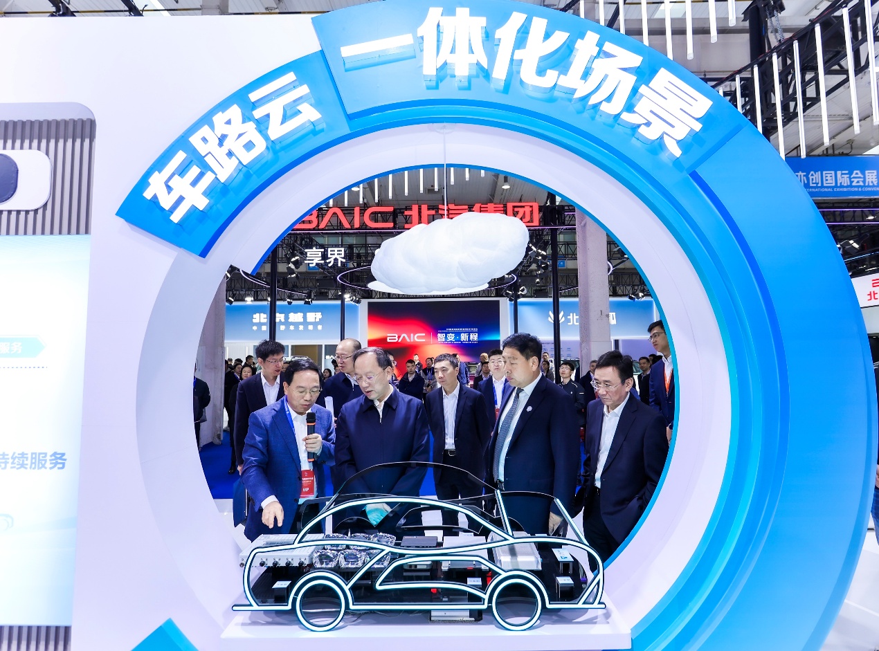 全国政协常委、经济委员会副主任、工业和信息化部原部长苗圩莅临展台,听取科智联副总经理于中腾关于科智联车路云一体化产业推进成果方面的介绍。